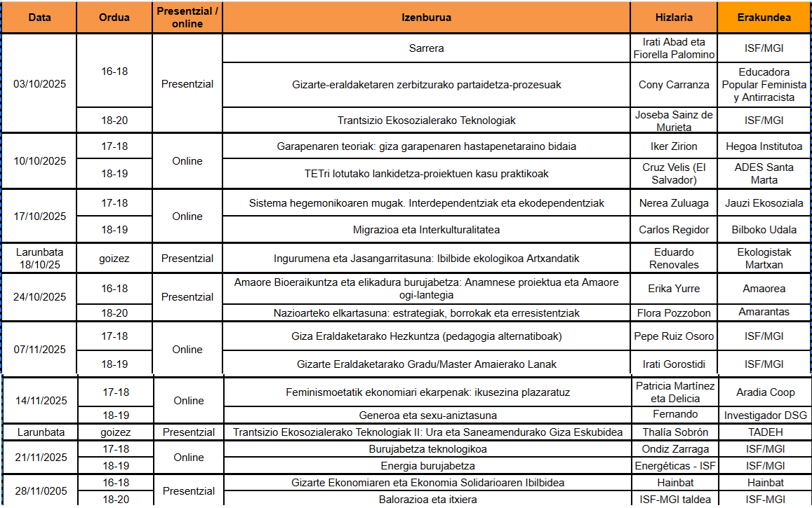 Egunak: ostiralero (jaiegunetan izan ezik), 2025ko urriaren 3tik azaroaren 28ra. Kanpora irteera urriaren 18an izango da, larunbata, goizez. Tailer praktikoa azaroaren 15an izango da ere, goizez.