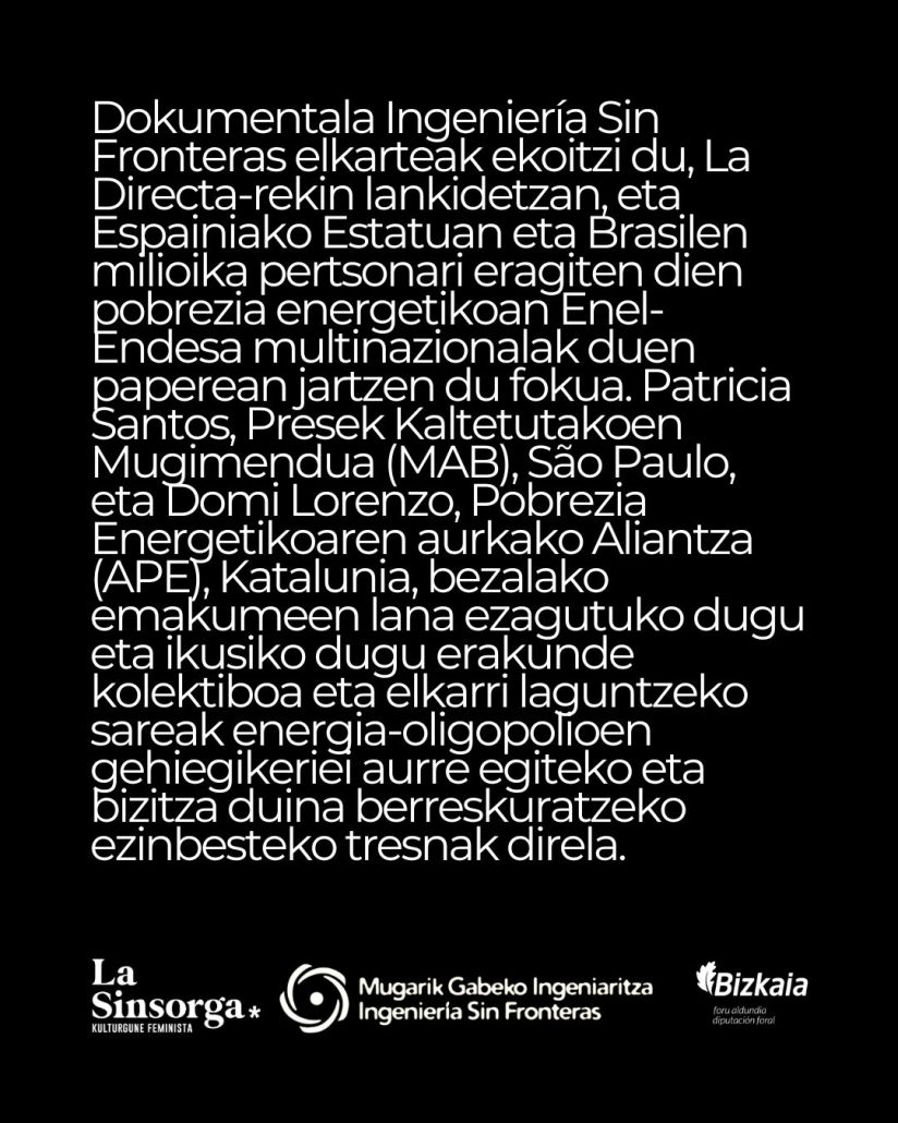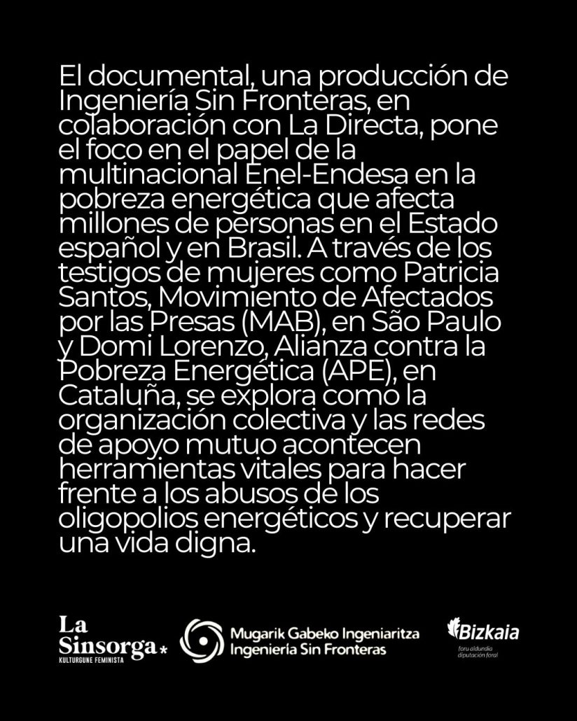 ISF/MGI Euskadik eta ESF Catalunyak Recuper la luz dokumentalaren proiekzioa antolatu dute. Mugarik Gabeko Ingeniaritza Catalunyak ekoitzi du, La Directarekin lankidetzan. Brasilen eta Espainian milioika pertsonari eragiten dien pobrezia energetikoan Enel-Endesak duen papera aztertzen du dokumentalak.